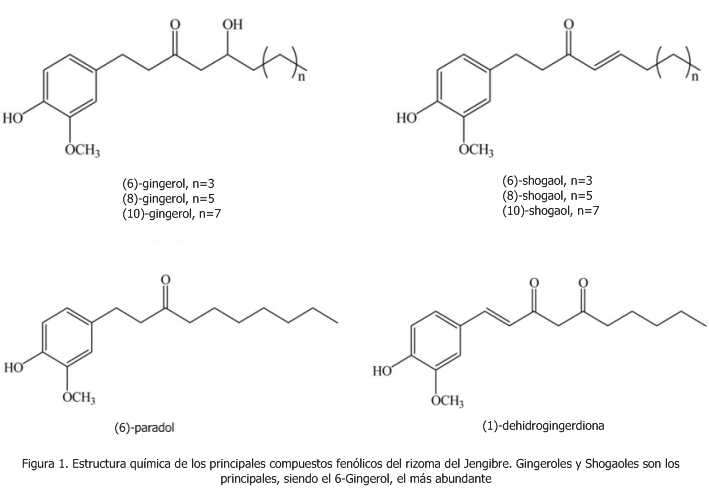 Cuantitativamente, en el rizoma del jengibre los componentes principales son los glúcidos (50-70%), los lípidos (3-8%), terpenos, compuestos fenólicos y algunos flavonoides (quercitina, capsaicina). Los compuestos fenólicos forman una oleorresina, que se ha denominado aceite de Jengibre. Entre los compuestos fenólicos, que confieren al jengibre su típico sabor picante, encontramos compuestos como gingeroles, paradoles y shogaol. Los gingeroles (23-25%) y el shogaol (18-25%) son los que se encuentran en mayor cantidad. En la figura 1 podemos ver su estructura química.