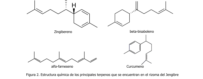 Los terpenos son aceites volátiles, y su cantidad en el rizoma está entre un 1% y un 3%. Entre los terpenos encontramos zingibereno, β-bisaboleno, α-farneseno, β-sesquifelandreno, y α-curcumeno. En la figura 2 podemos ver su estructura química.