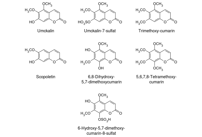 Principales cumarinas de la raíz de Pelargonium sidoides. Imagen Sponk.
