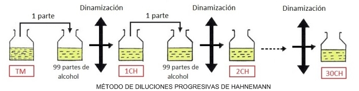 En el esquema del encabezamiento de la página, podemos ver como a partir de una botella que contiene TM (tintura madre), en nuestro caso de Arnica, se van elaborando progresivamente las diferentes diluciones (disoluciones), hasta llegar a aquella que nos interesa, la 30CH.