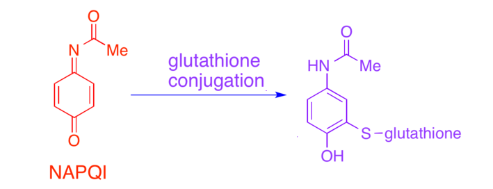 El NAPQI, en condiciones normales es rápidamente inactivado y detoxificado por el glutation. El glutation es una importante sustancia antioxidante natural, que se encuentra en todas las células de nuestro organismo. Este glutation, a través de sus grupos sulfhidrilo (SH-), va a participar en una reacción de conjugación directa del NAPQI, dando lugar a la formación de cisteína y de ácido mercaptúrico.