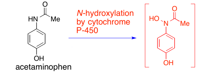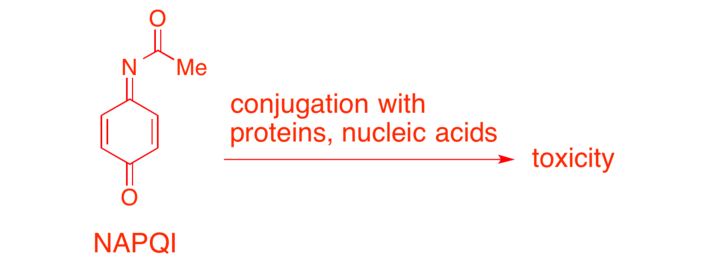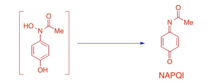 Allí un sistema enzimático de oxidasas mixtas convierte el paracetamol en su metabolito N-acetil-parabenzoquinona imida (NAPQI), una sustancia con una gran capacidad oxidante y extremadamente tóxica.