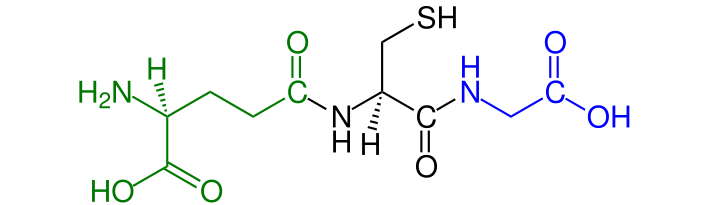 El Glutation está formado por ácido glutámico (verde), cisteína (negro) y glicina (azul). Imagen Jü