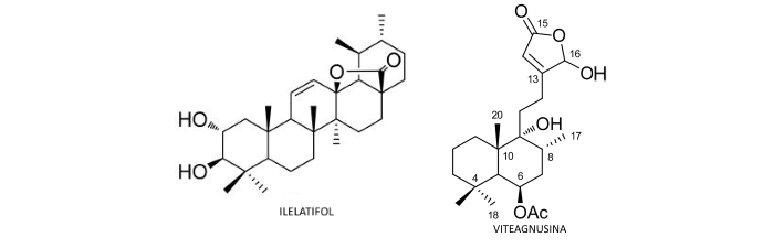 - Diterpenos: mayoritariamente del tipo labdano, como rotundifurano, vitexilactona, vitetrifolinas y viteagnusina17, 18. También se han aislado recientemente diterpenlactamas (vitexlactam)19, 20.