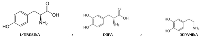 El otro es la Dopamina, una sustancia estimulante, que actúa en todos los procesos de estímulo, placer y recompensa del organismo. Se sintetiza a partir de los aminoácidos Fenilalanina y Tirosina. Actúa predominantemente por la mañana.