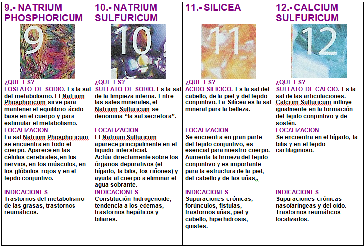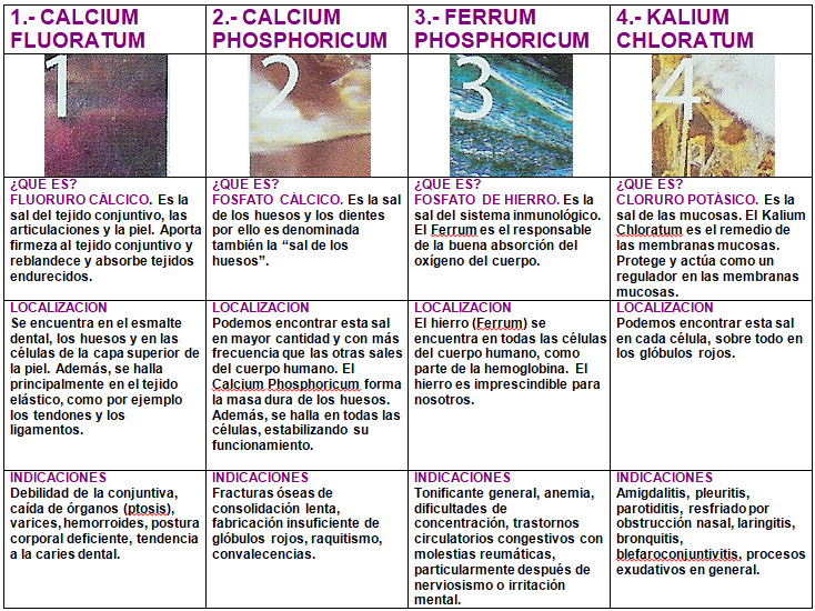 Son trituraciones homeopáticas con lactosa hasta llegar a la D6, potencia que Schüssler consideró idónea para ser absorbida a través de la membrana de las células. -