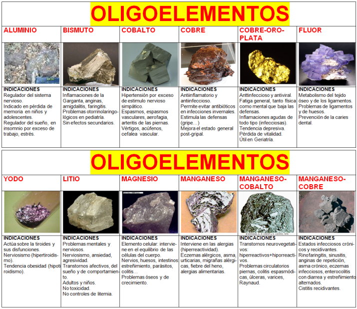 A continuación adjuntamos una tabla-resumen con las principales propiedades de los oligoelementos homeopatizados y sus combinaciones, que se utilizan en Oligoterapia.