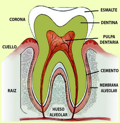 PULPA: Compuesta de tejido conectivo con gran cantidad de nervios, vasos sanguíneos y linfáticos. Está formada por las células odontoblastos, los cuales mientras se forma el diente, producen DENTINA. Una vez formado el diente la cavidad de la pulpa se mantiene más o menos constante. Sin embargo, los odontoblastos siguen viables y mandan proyecciones en forma de pequeños túbulos de dentina que atraviesan la totalidad de la dentina, es probable que tengan gran importancia en la nutrición del diente.